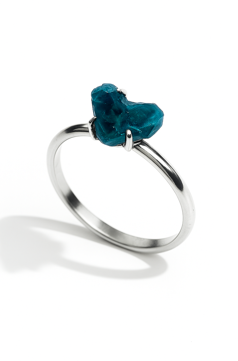 Představujeme Vám prstýnek s krystalem surového apatitu ve tvaru srdce navržený a vyrobený ručně v naší dílně v České republice.